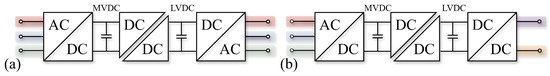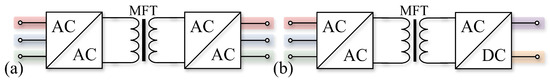 The most prevalent SST arrangement is the three-stage SST, with the AC/AC variety shown in Figure 16a and the AC/DC variety shown in Figure 16b. This arrangement relies on DC-links on both sides of the MFT. This dual DC-link characteristic is beneficial because it provides greater control over each module and makes the converter control easier. This high degree of control makes it suitable for CLLLC resonant DABs, as the power flow from the HV/MV and LV sides can be controlled independently of the isolation stage. This design is flexible and highly modular, making it suitable for various applications. It contains all the capabilities of the other two categories and expands upon them; however, these advantages come at the expense of having the highest component count. From a converter topology perspective, no significant changes from two-stage SSTs can be observed, as most of the topologies can be used in the three-stage configuration.