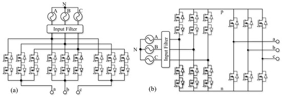 Topologies of (a) Direct Matrix Converters (DMCs) and (b) Indirect Matrix Converters (IMCs).
