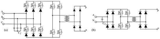 AC/DC rectification is a well-researched topic with many topologies, and its analysis is beyond the scope of this paper; therefore, only a few topologies that have seen SST implementation will be analyzed, represented in Figure 8 and Figure 9. Given that a bidirectional rectifier can function as an inverter, the two terms are used interchangeably during this review. Topologies that have seen widespread applications include diode and hybrid/active-switch rectifier structures with functionalities such as buck, boost, buck–boost, current shaping, and galvanic isolation [58,95,96]. Given that SST configurations are typically used in high-power grid-tied applications, input-stage PFC is highly desirable.