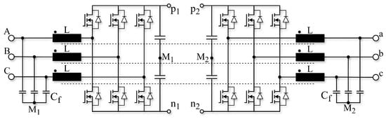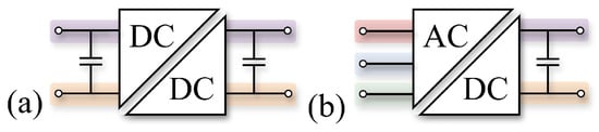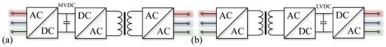 Indirect Matrix Converters behave similarly to DC-link AC/AC converters, as shown in Figure 5b, lacking the DC-link storage element. Although they are single-stage converters, they can be considered as being composed of two virtual stages, called the rectifier and inverter stages. After the virtual rectifier stage, the pseudo-DC-link current and voltage are inverted. The first stage contains 2n bidirectional switches, the purpose of which is to create a virtual DC-link voltage that is then inverted by the last 2m unidirectional switches. This topology increases the currents at low output frequencies [55,56,57]. IMC integration in SST applications was studied in [80,84,85,86,87]. As observed in these applications, IMCs can be used to replace the virtual rectifier and inverter stages. Taking further advantage of the virtual rectifier stage of the IMC, the weak DC-link concept has also been proposed, in which the capacitor/LC acts as a harmonics filter and not a power buffer [9,38,88,89] or functions only for resonant switching purposes [52,90]. Such configurations are common in unfolder-type SSTs. In [91], the DC-link consisted of a battery in a pulsating power buffer configuration, which can help to limit impact on the grid.