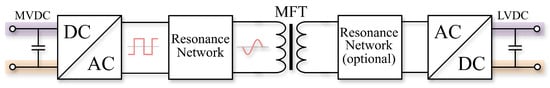 Another consideration is that the maximum power transfer is limited by both switching frequency and leakage inductance. As such, in order to achieve the smallest transformer size at the highest frequency, the leakage inductance of the MFT must be as small as possible [146,161]. This may not be possible in HV applications, where a certain isolation level is necessary and would increase the leakage inductance [23,158]. Fortunately, resonant DABs do not suffer from this limitation, as the resonance between the leakage inductance and the added capacitor cancels the reactive behavior and allows for power flow regardless of the isolation between primary and secondary. It is of note that if the resonance network has a series connected capacitor, it will act as a DC blocking capacitor [23,134]. As such, the improved power density, low switching losses, and indirect control of resonant DABs make them an obvious choice in high-power applications where efficiency is the dominant factor and where additional modules that can regulate the power flow.