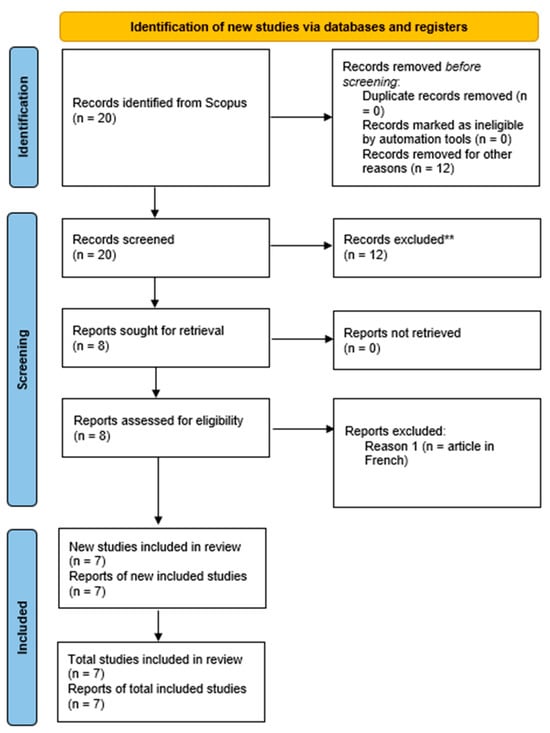 - Page, M.J.; McKenzie, J.E.; Bossuyt, P.M.; Boutron, I.; Hoffmann, T.C.; Mulrow, C.D.; Shamseer, L.; Tetzlaff, J.M.; Akl, E.A.; Brennan, S.E.; et al. The PRISMA 2020 Statement: An Updated Guideline for Reporting Systematic Reviews. BMJ 2021, 372, n71. [Google Scholar] [CrossRef] [PubMed]