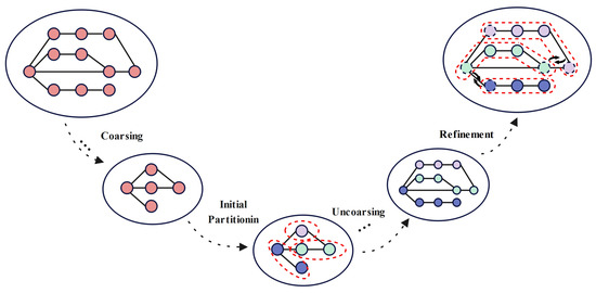 The coarsened graph was generated using Algorithm 1 in the previous section. The next step is to perform the initial partitioning. In detail, the vertices of the graph are assigned to k subsets (), ensuring that the number of vertices in each subset is as balanced as possible.