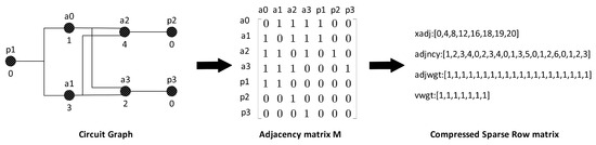 In digital integrated circuits, there are many types of complex connections, for example, the outputs of circuits are connected to multiple inputs, or a single output of a gate is connected to multiple inputs, etc. These connection types significantly increase the complexity of the circuit-partitioning problem. Thus, we employ graph theory to mathematically model the integrated circuits. The vertices of the graph represent the components in the circuit, while the edges represent the connections between these components. An adjacency matrix is used to collect the information of the graph, where an element corresponds to a connection. Usually, the adjacency matrix is relatively sparse and contains many zero elements. It is thus compressed and stored in the Compressed Sparse Row (CSR) format to reduce the storage requirements for large-scale circuits.
