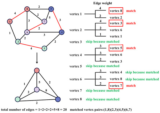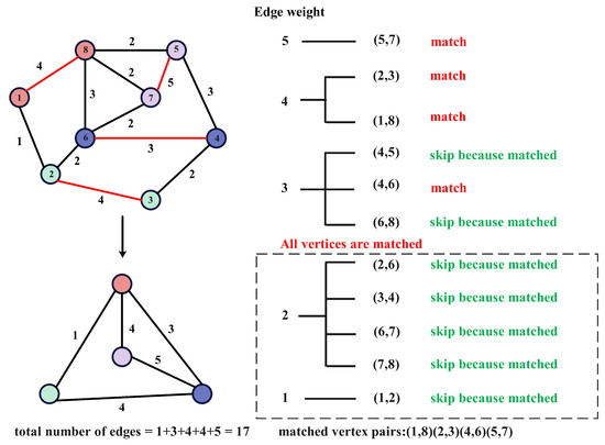Figure 4. The edges are first sorted by weights. Then, the vertices corresponding to the maximum weight edge, vertices 5 and 7, are matched. Next, other vertices are iteratively matched based on edge weights, resulting in a coarsened graph with 17 edges, which is a reduction of 3 edges compared to the maximum weight matching in