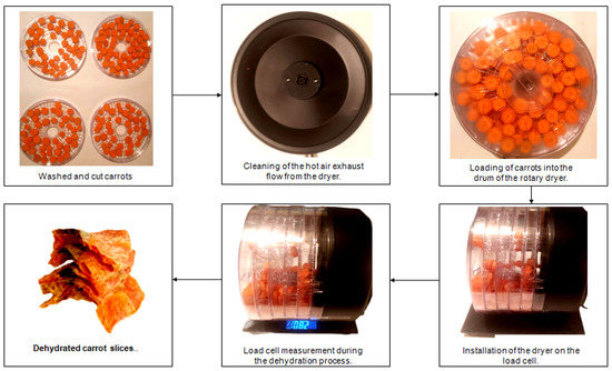 Semi-washed carrots harvested from the field were used as the primary material for this study. The samples were stored at 5 ± 0.5 °C under refrigeration conditions until further processing. After storage, the carrots were divided into batches of 1.5 kg, 1.0 kg, and 0.5 kg for experimentation. During the dehydration stage, the batches were subjected to an average temperature of 70 °C in a rotary dryer until the moisture content in their mass was reduced to below 10%, as shown in Figure 1.