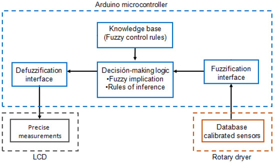 Defuzzification is the final stage, which transforms the fuzzy results obtained in the inference stage into a specific and precise value for analyzing the process parameters, in this case, the dehydration of carrots. Figure 6 shows a diagram of the fuzzy system architecture for the rotary dryer, developed to execute all the stages on the system’s microcontroller.