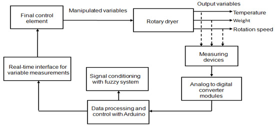 The dryer cylinder has a thickness of 5 mm, a diameter of 30 cm, and a length of 35 cm. LM35 temperature sensors (Texas Instruments, Dallas, TX, USA) are placed at the entrance and exit of the rotating drum, as well as at a midpoint during the dehydration process. The weight sensors of the dryer are equipped with an HX711 amplifier module (Avia Semiconductor Company, Xiamen, China), which converts the analog signals into digital signals for integration into a signal conditioning system based on fuzzy logic, developed in MATLAB and programmed in the Arduino microcontroller (Arduino AG). For the implementation of the sensing system in the rotary dryer, external libraries were used that optimize communication and device management. In the case of the LCD display, the LiquidCrystal.h library was used, which allows interfacing with displays based on the Hitachi HD44780 controller (Hitachi Ltd., Tokyo, Japan). To read the LM35 temperature sensor, the native functionality of the Arduino microcontroller was used for the acquisition of analog signals, without the need for a specific library, since the sensor delivers a voltage output proportional to the temperature. This intelligent measurement system allows for precise and reliable results in the measurements [26], as shown in Figure 2.