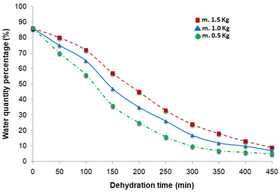 The parameters analyzed included the heat required for the dehydration process, the energy transfer between the hot air and the carrot surface, the dehydration rate, and the drying efficiency. Figure 8 illustrates the relationship between dehydration time and the amount of moisture in the carrot during the drying process for different initial masses. Compared with the solar dehydration method, the moisture removal process using a rotary dehydrator demonstrates considerably higher efficiency [39]. This method showed that an increase in operating temperature significantly reduces the time necessary for dehydration.