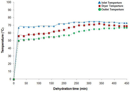 During the dehydration process of the initial carrot mass samples, an average temperature of 65 °C was monitored at the mid-point of the rotary dryer, with variations ranging from 56 °C to 72 °C. At the same time, average inlet temperatures of 71 °C were recorded. It was observed that the temperature at the dryer inlet did not increase significantly during the process, as it is monitored in the phase with the least thermal energy loss. On the other hand, an average temperature of 60 °C was obtained at the outlet of the system at the end of the dehydration process.