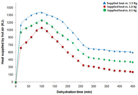 In the case of the initial mass of 0.5 kg, the largest amount of heat contributed by the dryer air flow was 1093 kJ, as shown in Figure 10. As it was the smallest mass, the drying process required less thermal energy to eliminate moisture, which is aligned with project investigations of the effects on dehydration processes [33], lit was observed that small masses require less heat due to their lower water content and greater area of exposure to hot air. The reduction in the amount of energy needed for smaller samples is a common trend in food dehydration processes [24].