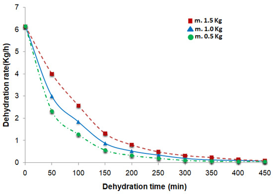 During the drying process, the maximum temperature is monitored and the greater change in the water content of the product accelerates dehydration. Evaluation of the drying parameters revealed that the initial mass of 0.5 kg exhibited the highest dehydration efficiency compared to the other initial masses. These results are in agreement with the findings of Rani and Tripathy [32], who found that air flow and drying temperature have a direct impact on the drying rate of pineapple slices, favoring shorter drying times when optimizing these parameters. Figure 11 illustrates the variations in the dehydration rate, highlighting the corresponding reduction in the water content of the carrot. The results demonstrate that the dehydration rate is directly proportional to the percentage change in the water mass of the product, making the process more effective.