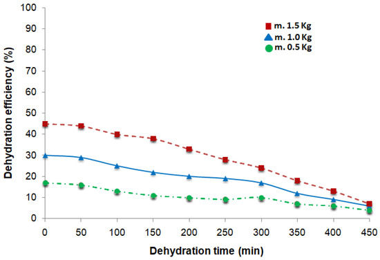 In this analysis of the dehydration process, the efficiency is calculated based on the collected data, which include moisture content, thermal energy distribution, and the heat monitored throughout the 450 min of drying. Figure 12 demonstrates that the highest dehydration efficiency occurs with the 1.5 kg mass. This is due to the fact that the most efficient dehydration occurs when the water content in the carrots remains relatively high. Maximum efficiency is observed at the beginning of the process, as a large amount of thermal energy is supplied to reduce the water mass in the carrots. However, efficiency decreases as the drying time progresses, as more thermal energy is lost relative to the decreasing water content. The maximum efficiency achieved during the carrot dehydration process was 45% with an initial mass of 1.5 kg. For the 1.0 kg initial mass, the efficiency was 30%, while for the 0.5 kg initial mass, it reached 17%.