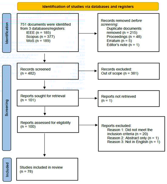 In Figure 1, the complete document identification and processing steps are presented following the PRISMA guidelines. Throughout the steps of the document selection process, both researchers worked independently and cross-checked their decisions. In case there was a disagreement, the results were further discussed. A total of 751 documents were identified from IEEE (n = 185), Scopus (n = 377), and WoS (n = 189). Before the screening, 269 documents were removed as they were identified as duplicates using both automatic and manual processes (n = 215). Additionally, some documents were excluded as they were proceedings (n = 48), erratum (n = 5), or editor notes (n = 1). As a result, 482 documents were screened based on their titles and abstracts. The main inclusion criterion set was for a study to focus on the use of serious games and/or digital games in K-12 education in the context of computational thinking and/or programming. No exclusion criteria were used to ensure that the inclusion of a study in the analysis was solely based on it meeting the inclusion criterion. Hence, for a document to be considered relevant to the topic and be included in the analysis, it had to meet the specific criterion. In total, 381 documents were removed since they did not meet the inclusion criterion and were, thus, deemed out of the study scope. The remaining 101 documents were sought for retrieval. With the exception of one document, which was not retrieved despite the efforts made by searching in academic databases and websites and contacting the authors, the files of the remaining 100 documents were retrieved. Prior to further examining the full-text of the documents, based on the scope of the study and the research questions set, a literature review matrix was created to aid in the identification and extraction of relevant information. Having the literature review matrix prepared, the variables of which are analyzed in Section 4, the full-text of the remaining documents was examined. Twenty documents were removed since they did not meet the inclusion criterion, one document was removed since it was not written in English, and one document was excluded since it was an abstract only. Consequently, 78 documents remained and were included in this analysis.