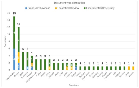 To better understand the scope of the studies contained in this analysis and their characteristics, this subsection focuses on analyzing the specifications of the 78 documents examined in the study (RQ1). Initially, based on the three categories set, the number of documents that each country published and their type were explored. The related outcomes are presented in Figure 2. It should be noted that the corresponding author’s country was considered, and in the case that no corresponding author was specified, the country of the first author was used. Based on the outcomes, most studies were published by the United States (n = 15, 19.2%), followed by Greece (n = 12, 15.4%). Both Spain and Indonesia published five documents (6.4%), followed by Sweden (n = 4, 5.1%). Hong Kong, Turkey, Estonia, and China all published three documents each (3.8%), while Slovakia, Japan, Israel, Brazil, Malaysia, and Taiwan published two documents each (2.6%). The United States, Greece, Spain, and Indonesia were the countries that contributed the most Experimental and Case studies. Additionally, the United States published the most Proposal and Showcase studies while Greece published the most Theoretical and Review studies.