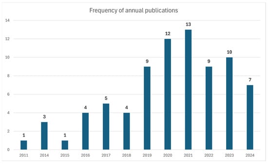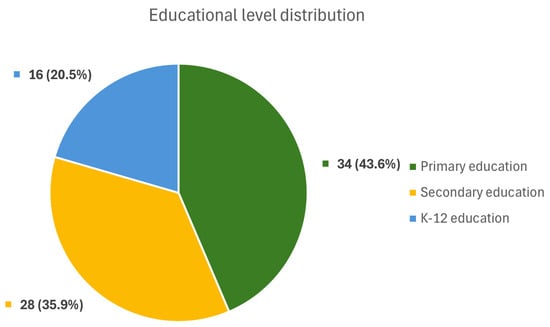 Given the scope of the study to examine the impact of serious games and digital games on students’ computational thinking and programming skills in K-12 education, the educational level, which the studies focused on, was also explored. As can be seen in Figure 3, most studies examined the influence of serious games in primary education (n = 34, 43.6%), followed closely by those focusing on secondary education (n = 28, 35.9%). Additionally, 16 studies (20.5%) focused on both primary education and secondary education. Based on the outcomes, it can be inferred that equal emphasis is placed on both primary education and secondary education which, in turn, highlights the importance of improving students’ computational thinking and programming skills from a young age. Finally, based on the annual number of published documents presented in Figure 4, it can be seen that most documents were published in 2021 (n = 13, 17%) and 2020 (n = 12, 15%).