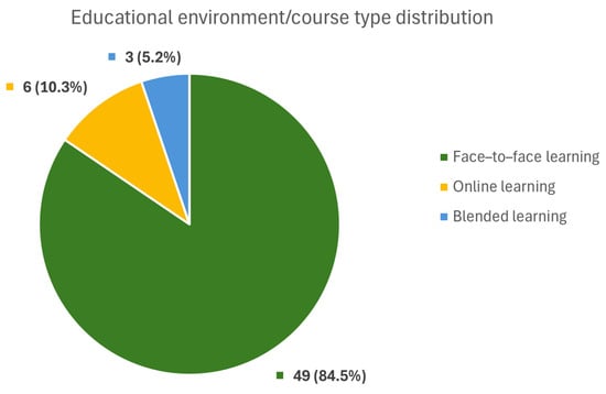 Given the main field in which computational thinking and programming are taught, all studies focused on computer science courses. However, most documents did not specify any certain course details (n = 50, 86.2%). Of the few studies that did mention some specifications, the most commonly used programming language was Python. The educational environment in which the intervention is being applied and the course type can influence the educational outcomes. Hence, the course type and educational environments were also examined. The related outcomes are presented in Figure 6. Most studies focused on face-to-face courses (n = 49, 84.5%) while some adopted serious games in online courses (n = 6, 10.3%). Few studies also integrated serious games within blended learning environments (n = 3, 5.2%). These outcomes highlight the potential of serious games to be adopted and integrated into various educational environments and support teaching and learning activities. Simultaneously, these results reveal the emphasis on supporting face-to-face education and the ability to more easily carry out controlled studies in such environments. As such, it can be inferred that serious games can also enrich traditional methods of teaching.