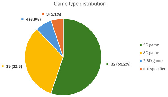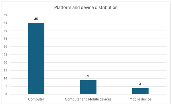 Furthermore, given the scope of this study, emphasis was put on the analysis of the serious games adopted by the related studies. The games were separated into 2D games, 2.5D games, and 3D games. Particularly, 2D games refer to two-dimensional games that are characterized by the restriction of movement to height and width, 2.5D games are a blend of 2D and 3D games in which mechanics are intertwined, and 3D games are three-dimensional games that enable movement across depth, height, and width. Based on the outcomes presented in Figure 7, most studies integrated 2D games (n = 32, 55.2%), followed by those that integrated 3D games (n = 19, 32.8%). Four studies (6.9%) used 2.5D games while the specifications of the games that three studies (5.1%) used were not clearly specified within the text or were not clearly depicted in the figures used. Additionally, most of the games used were targeted at computer devices (n = 45, 77.6%) while only four studies (6.9%) utilized games targeted at mobile devices. A total of nine studies (15.5%) integrated games that could be used on both computer and mobile devices. The related outcomes are presented in Figure 8. Based on these outcomes, it can be inferred that most studies focused on developing or integrating games meant for computers which students are already familiar with and mostly practice their programming skills on. Additionally, most studies adopting 2D games can be attributed to the target group of young students as it is easier for students to comprehend them and interact with them. These outcomes also highlight the preference for the simplicity and accessibility of 2D games when teaching young students about complex concepts and promoting their computational thinking.