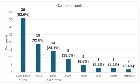 Furthermore, the significant majority of studies did not mention a specific operating system that their game was played on. However, of the few studies that did specify the operating system, Windows for computer devices and Android for mobile devices were mostly used. Most studies (n = 45, 77,6%) also did not clearly specify whether the game they used or developed was open-source or closed-source. Of the few studies that provided details, eight used closed-source games (13.8%) and five used open-source games (8.6%). Despite the limited number of studies that reported this information, the ability to adopt both closed-source and open-source games further highlights the variety and applicability of serious games. Based on the outcomes, there was a balance between using existing games (n = 31, 53.4%) and developing new ones (n = 27, 46.6%). These results highlight the fact that although existing games might have not been strictly developed for educational purposes, they can still be used to support students’ learning. Finally, Figure 9 presents the main game aspects identified within the documents. The games used mostly included block-based coding activities (n = 36, 62.0%), had various levels with changing difficulties (n = 19, 32.8%), and focused on activities that cultivated students’ basic programming knowledge and principles (n = 14, 24.1%). It should be noted that in these activities, students could examine and interact with existing code but also write their own code. Additionally, the games integrated mazes (n = 9, 15.5%), puzzles (n = 3, 5.2%), quizzes (n = 3, 5.2%), and platformers (n = 2, 3.4%) which highlight the vast number of interactive activities and tasks that can be used within serious games and digital games. In the “Others” category (n = 5, 8.6%), cases such as pattern recognition, board games, and interactive debugging activities were included. Finally, the development approaches followed to create the games were examined. However, the significant majority of studies did not specify a particular approach. Of the studies that clearly specified the approach they followed to develop their game and integrate it into educational settings, the Analyze, Design, Develop, Implement, and Evaluate (ADDIE) design model was mostly used.