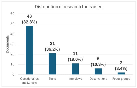 Additionally, most studies followed a quantitative research approach (n = 41, 70.7%) while some studies adopted a mixed methods approach (n = 15, 25.9%). Only two studies followed a qualitative research approach (n = 2, 3.4%). These outcomes were further examined focusing on the evaluation tools used. The related results are presented in Figure 10. It should be noted that some studies adopted a combination of the evaluation tools identified; thus, the total number sums up to more than 58 which is the total number of documents included in this analysis. Particularly, questionnaires and surveys were the most commonly used evaluation tools (n = 48, 82.8%), followed by tests (n = 21, 36.2%). Studies also integrated interviews (n = 11, 18.9%), observations (n = 6, 10.3%), and focus groups (n = 2, 3.4%) to better understand the influence of serious games on students and their perspectives and experiences.