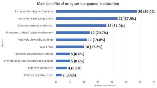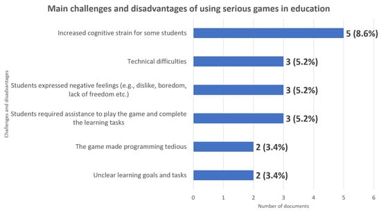 Furthermore, emphasis was placed on identifying the main benefits and challenges associated with the adoption and use of serious games in education. To provide a better representation of the related outcomes within the literature, all documents from all three categories were examined. Table 3 presents the key benefits that emerged while Table 4 depicts the main challenges and disadvantages identified (RQ2). The related outcomes are further analyzed in the Discussion section.