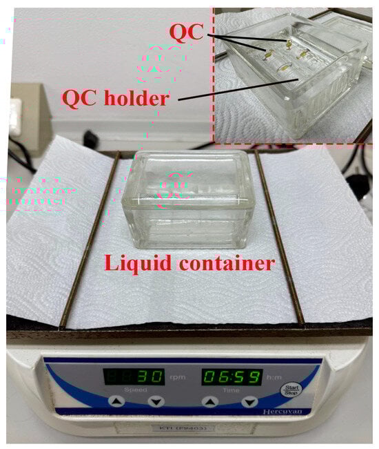 A shaker instrument with a specially designed glass holder (to hold the QCs) was used to clean the QCs, remove the unbound DNA, and de-hybridise the target. Inset image shows the QC holder with QCs.