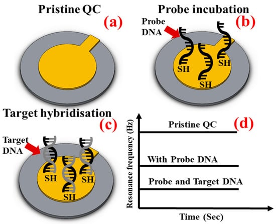 Schematic representation of each step of the dry-QCM technique: (a) fresh QC, (b) probe DNA incubation, (c) target DNA hybridisation, and (d) frequency response in each step.