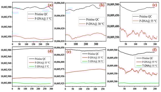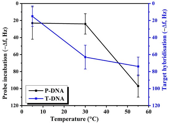The probe incubation and target hybridisation processes are vital to DNA and/or RNA biosensors. Factors such as the potential of hydrogen (pH), ionic strength, temperature, and concentrations play a key role [,,]. Surface suppression is likely caused by steric and electrostatic hindrance in the probe DNA SAM films. To validate the temperature effect, P-DNA was initially incubated at 5 °C, 30 °C, and 55 °C. Measured frequency shifts were −23.4 ± 19.1, −24.3 ± 12.6, and −97.2 ± 13.7 Hz, respectively, at 5, 30, and 55 °C, as shown in Figure 3. P-DNA incubation at an elevated temperature (55 °C) gave a higher frequency shift and hence better self-assembled P-DNA formation. It might have been due to the activation of Au-S bonds at elevated temperatures [,,]. Similarly, T-DNA was hybridised on a prefabricated (incubated at 55 °C) P-DNA sensor at 5 °C, 30 °C, and 55 °C. The obtained hybridisation frequency shifts were −15.6 ± 12.2, −63.4 ± 14.8, and −74.6 ± 15.5 Hz, respectively, for 5, 30, and 55 °C, as shown in Figure 3. It is evident that T-DNA hybridisation is better at an elevated temperature (55 °C) compared to lower temperatures. All the measured frequency responses are shown in Figure 3, and corresponding frequency shifts are shown in Figure 4.