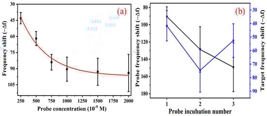 (a) Optimisation of probe concentration and (b) effect of sequential probe incubations (black colour) for better target hybridisation (blue colour) and corresponding frequency shifts.
