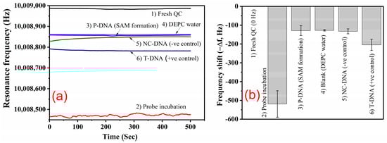 To assess the selectivity of the non-fouling target, NC-DNA diluted in 0.5 M HEPES solution was directly incubated in the QCM chamber for 30 min. The frequency shift due to the NC-DNA was around −13 ± 6 Hz from the P-DNA level, which could be due to the non-specific absorption of NC-DNA. To assess the selectivity of the complementary target, T-DNA diluted in 0.5 M HEPES solution was directly incubated in the QCM chamber for 30 min. The frequency shift due to T-DNA hybridisation was around −204.5 ± 29.7 Hz from the baseline and −75.8 Hz from the P-DNA reference level. From Equation (2), the estimated amount of T-DNA attached to the P-DNA was around 0.36 ng/cm2. The target hybridisation efficiency can be calculated by dividing the frequency shift due to the total number of probes with the frequency shift due to probe–target hybridisation, and the estimated hybridisation efficiency was about 58.9%. Probe density-dependent kinetics or steric constraints may alter the apparent stability and selectivity of probe–target binding in surface-immobilised oligonucleotides. Both the rate of target capture and the extent of hybridisation strongly depend on surface probe density [,]. The efficiency of hybridisation strongly depends on the availability and orientation of P-DNA. Respective time-dependent resonance frequency values are shown in Figure 6a, and frequency shift graphs are shown in Figure 6b.