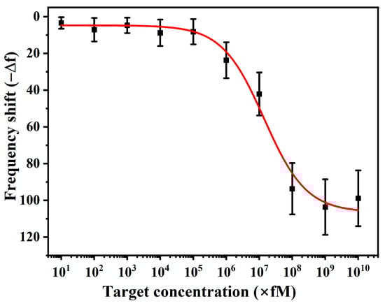 where is the lowest detectable concentration, and is the standard deviation of the baseline signal. Using the lowest concentration measurement (10 fM) as the baseline, we estimated was 3.1 Hz by solving for the concentration corresponding to a frequency shift equal to A + . The calculated LoD was approximately 1.22 nM. This value represents the minimum concentration at which the sensor provides a distinguishable response from the noise level, demonstrating our system’s high sensitivity.