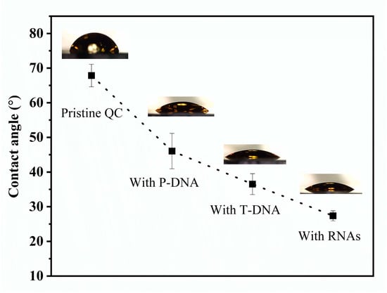 Contact angle measurement on pristine QC, with P-DNA immobilisation, after T-DNA and ssRNA hybridisation.