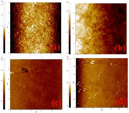 AFM surface morphological 2D images of (a) fresh QC electrode, (b) with P-DNA immobilisation, (c) with T-DNA hybridisation, and (d) with COVID-19 RNA hybridisation.