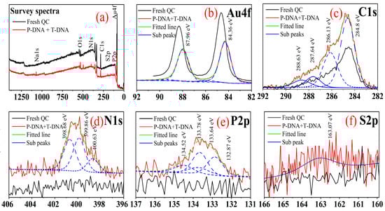 XPS is an effective method for analysing the SAM formation on the sensor surface and allows a detailed examination of the surface composition and the chemical states of elements within the SAM by identifying functional groups or bonding environments on the surface. XPS characterisation of P-DNA SAM formation and T-DNA hybridisations are shown in Figure 10. Figure 10a describes the survey spectra of all the detected elements before and after hybridisation. High-resolution scans were acquired using a 45° take-off angle for the peak regions typical for Au4f, C1s, N1s, P2p, and S2p peaks. The observed negative shift in the Au 4f peak from 84.6 to 84.1 eV (as shown in Figure 10b) after DNA immobilisation is primarily due to the charge transfer from the negatively charged DNA to the gold surface rather than the expected positive shift from Au–S bond formation. Ar plasma cleaning played a crucial role by removing surface oxides, exposing more reactive gold sites, and enhancing electron density, which further contributed to the negative shift. Additionally, the presence of high-density DNA coverage and electrostatic interactions modified the local work function and dipole potential, reinforcing the shift toward lower binding energy. The C1s peak can be deconvoluted into the four most prominent peaks, as shown in Figure 10c. These peaks at 284.9, 286.13, 287.6, and 288.63 eV are attributed to C=C, C–O, C=O, and O-C=O bindings, respectively [,,]. The N1s region has three broad peaks at 398.6, 399.86, and 400.63 eV, which can be attributed to C–N or –C–NH, –C=N–, and –NH bonds, respectively (as shown in Figure 10d) [,,,]. Deconvolution of the P2p signal should be a doublet with BEs of 134.84 and 134.00 eV. However, a single peak was able to fill due to a very weak signal (Figure 10e). To a better extent, the presence of both N and P together is an excellent indicator of the probe/target DNA adsorbing to the electrode, because N and P surface contamination is typically very rare during sample preparation and handling. The peak at 163.01 eV in the S2p spectra is specifically attributed to the S-Au bond, as shown in Figure 10f. Obtaining the S peak is very difficult since its abundance is very low in SAM, and the existence of the S peak is direct evidence of SAM formation [,]. There was not any peak between 163 and 164 eV associated with unbound thiol groups, and the peak at 167.4 eV was assigned to fully oxidised sulphur. However, both peak regions were observed in unwashed sensor chips XPS spectra. This means that the unbound and oxidised sulphur-containing probe DNA was washed away during the cleaning steps and only remained bound to thiol oligonucleotides.