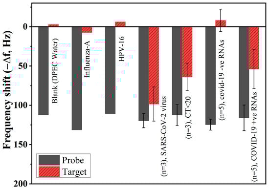 A sensor’s specificity can be significantly enhanced with nonspecific target controls for its point-of-care diagnosis. Cross-reactivity was determined using the influenza-A sample with no absorbable frequency shift, indicating non-reactivity with the developed assay. In fact, influenza-A is in the same family as the SARS-CoV-2 virus, and the anticipated result was non-reactive. Similarly, cross-reactivity with a cervical HPV-infected (non-specific target control) sample was tested and found to be non-reactive with the developed assay. It can be seen that the frequency shift values for the blank (DEPC water), influenza-A, and HPV-16 are +2.72 Hz, −7.53 Hz, and 6.19 Hz, respectively, as shown in Figure 11. The utilised oligonucleotide RdRP P-DNA gene is non-complementary to any SARS family and human mRNAs [].