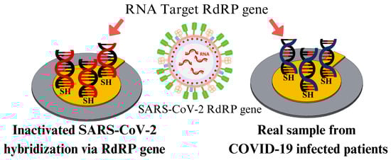 The specifically designed 21-base oligonucleotide thiol probe DNA (P-DNA) and complementary DNA (C-DNA) sequences of SARS-CoV-2 were obtained from Bionics Co., Ltd., Seoul, Republic of Korea. The P-DNA and C-DNA were designed based on the SARS-CoV-2 virus RdRP gene as the National Institute of Health (NIH) [] recommended. Non-complementary DNA (NC-DNA), human papillomavirus 16 (HPV-16), and influenza-A were used for the control experiment. The inactivated SARS-CoV-2 whole virus swab was purchased from HELIX ELITE Microbiologics Pvt. Ltd., Saint Cloud, MN, USA. All reagents obtained were highly purified and were used directly without further purification. The COVID-19-affected RNA samples were collected from Suranaree University of Technology Hospital (SUT-H), Thailand.