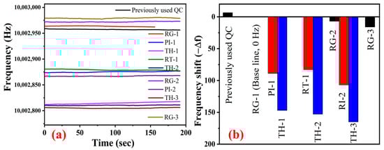 In this study, regeneration steps removed the DNA SAM layer, thiolate surface and oxidised Au sensor surface. The regenerated sensor frequency shifted positively (~+10 Hz) compared to the pristine QC, as shown in Figure 13. The proclaimed efficiency of sensor regeneration using NaBH4 is about 90% []. Ultrasonication can remove the physisorbed contaminants and break the covalent bonds by cavitation (20–70 K Pascals and localised temperature up to 5000 K) []. Plasma cleaning/etching (here we used Ar gas plasma) is an effective and efficient technique to remove metal oxide layers (a few nanometres) []. The energised Ar ions are enough to knock out a few atomic layers of the sensor surface (Au surface), which might be thiolated Au (Au-S) and oxidised Au, and those exhibit a positive shift in the sensor frequency. This developed protocol has 100% efficiency in sensor regeneration and creates a highly hydrophilic Au surface (supposed to have +ve charge), which is essential for probe (−ve charged Au-S DNA) incubation. In fact, each sensor could regenerate more than 15 times in our case study, and the generated sensor could be used as new for further experiments.