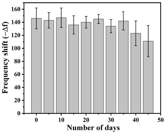 The analytical performance of the developed sensor was also evaluated over a month, as shown in Figure 14. Sensor stability was assessed every 5 days for 45 days, and frequency responses were measured. The results showed that the sensors were effectively preserved for a certain period and later degraded gradually. The biosensor generated a stable response over 25 days with a deviation of −12 Hz, the value of which corresponds to the blank QC variation with DPEC water, and further degradation might be attributed to the denaturalisation of P-DNA strands from the sensor. This establishes the shelf-life of the biosensor over the specified duration.