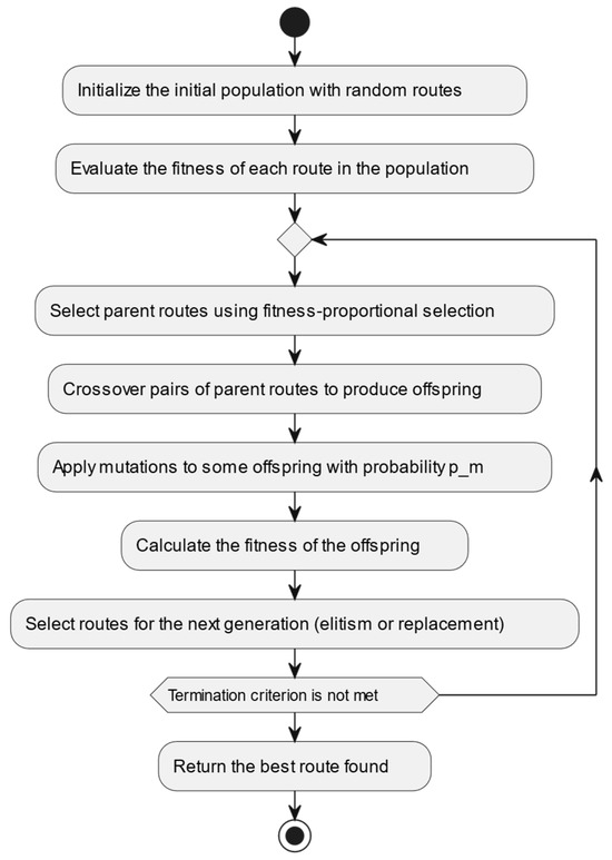 Genetic algorithms are optimization techniques based on principles of genetics and natural selection, being especially useful for solving complex problems, such as route planning [21,22]. These algorithms are ideal for environments where delivery directions and conditions change daily, as they can adapt and find optimal solutions under varying circumstances [23]. This is crucial for last-mile logistics, where each day can present a unique set of delivery challenges. The generic application of the basic scheme of a genetic algorithm to the problem of route exploration (without going into further detail) would be as presented in Figure 1.