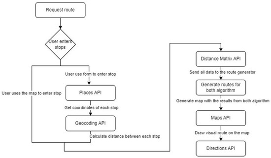 Several APIs from the Google Maps Platform [39] ecosystem have been used for information pre- and post-processing to simplify development, as can be seen in Figure 2. Other open and low-cost alternatives could have been used (such as OpenStreetMap [15], Leaflet [40], or Mapbox [41]), but simplicity and interoperability have prevailed in this case to focus all efforts on the development of the genetic algorithm and a Demonstrative System. Specifically, the following APIS were used: