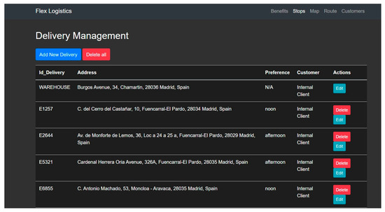 To build the proof of concept, we have prioritized a system that can meet the requests of the researcher quickly and intuitively, for this purpose the project has been separated into frontend, backend, and database. The system to speed up the testing is deployed in the cloud (detailed in Section 3.3); to favor accessibility and make the system intuitive, an interface has been developed to control the different test configurations (stops, clients, and routes). As shown in Figure 3, researchers can see the complete list of stops and edit or delete the selected one. Additionally, a new delivery can be added to the system, thanks to a modal connected to Google Maps that will help the researcher to find the address to add. For faster assessment, an interactive map is also available to the researcher where they can add stops by simply clicking on the map and clicking on the button to add them all at once to the system.