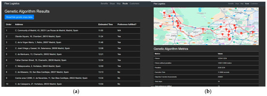 This allows for rapid test modifications to verify the results in this case. There will also be a section to check the results of the algorithms with the previously configured stops, where it will be possible to see the order chosen by the algorithms, the estimated time of the same, and whether the assigned preference has been fulfilled (Figure 4a). In addition, a map and the resulting metrics for each of the algorithms are displayed in Figure 4b.