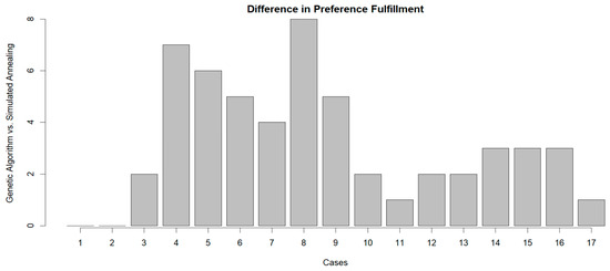 Difference between the preferences satisfied between the two algorithms (preferences satisfied by GA vs. preferences satisfied by SA).