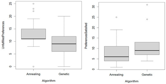 Comparison of the performance of the annealing and genetic algorithms on two metrics: number of unfulfilled preferences and number of satisfied preferences.