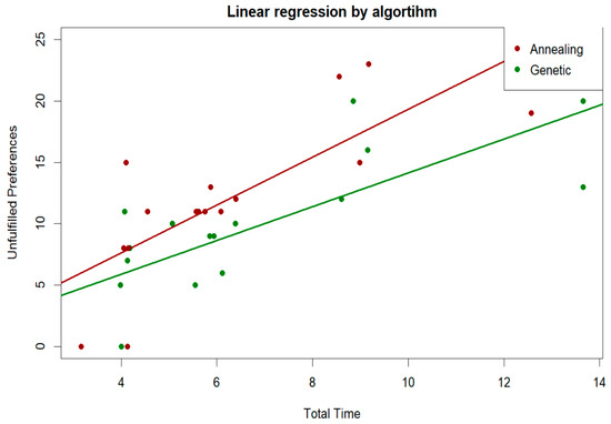 Linear regression of the two algorithms with respect to preferences satisfied and total route time.