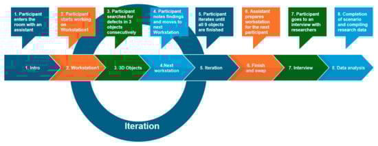 - The participant moves to the next workstation and thus passes through all three workstations and all nine of the 3D objects.