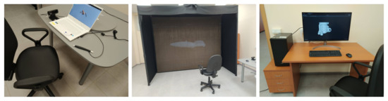 In order to ensure less interference by outside factors such as light, the glass windows and the glass door panels were covered using black foil. The aim was to achieve almost complete darkness for the hologram workstation light condition recommendations. Several photos of the room with each experiment workstation, as well as the experiment environment, can be seen in Figure 3.