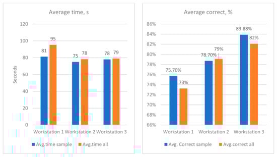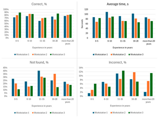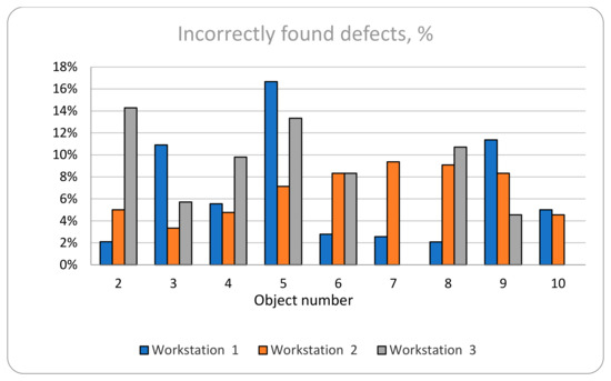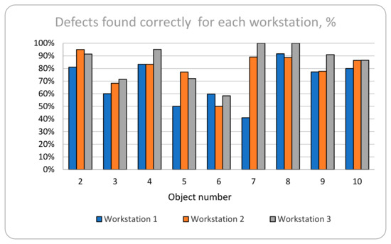 This slice of the participants’ results was collated in separate tables for closer analysis. Determining their level of success compared to the average of the entire participant population was the goal of this part of the analysis. Three similar tables were separately introduced for each workstation. The number of defects denotes all of the defects present in all of the objects that were presented to the participant at the workstation, where “correct” indicates the number of defects that were successfully recognized, and “not found” indicates the number of defects not found (the “correct” and “not found” together comprise 100% of the total number of defects). The number of incorrectly found defects is not a composite part of the entire number of defects, but rather things that were noted that were not effectively defects, but original parts of the functioning object. The results can be observed in the three following tables: workstation 1—Table 10; workstation 2—Table 11; workstation 3—Table 12.