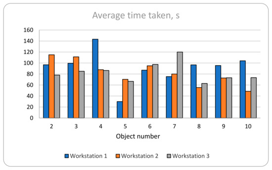 From the category for the difficulty evaluation, question Q12 was examined in detail (“How easy was the work during each stage of the experiment?” Q12A was related to workstation 1, Q12B to workstation 2, and Q12C to workstation 3). All participants who answered with 5 (that the workstation was extremely easy to work with) had their experiment results analyzed in detail in order to juxtapose their subjective view to their objective results. The number of each participant and their count by question can be observed in Table 9. The analysis of Q12 is of significant importance, as it is closely related to the main goal of this research.