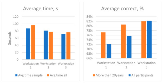 Figure 15 compares the average of the sample and the average of the entire participant population. It can be observed that fewest participants responded that workstation 1 was extremely easy to work with, and from their results, it can be concluded that they were faster and had more correct responses compared to the average. The same can be concluded for workstation 3. The averages for workstation 2, however, showed very close results between the average participant and the select sample size.